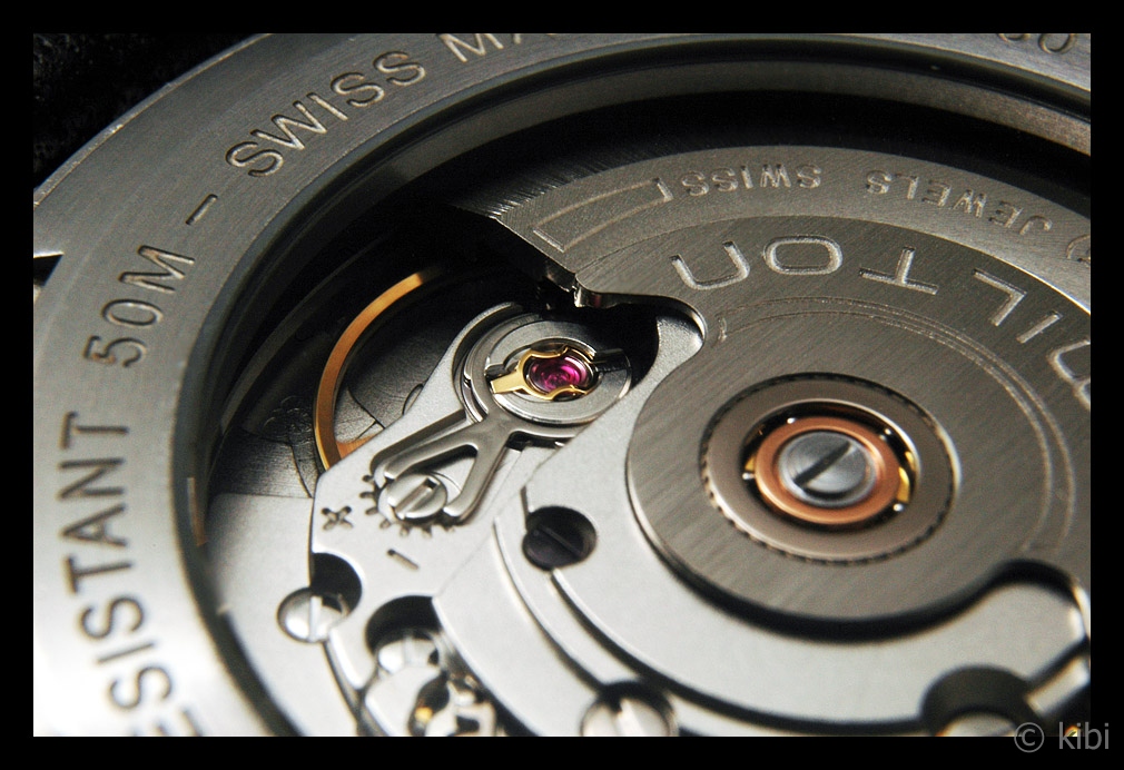 Průhledem (také nepoškrábatelný safír) v dýnku je vidět švýcarský mechanický strojek ETA 2834 s automatickým nátahem. Kromě funkce zobrazování času ukazuje datum a ve velkém okénku na pozici „12“ ciferníku také označeni dne v týdnu.